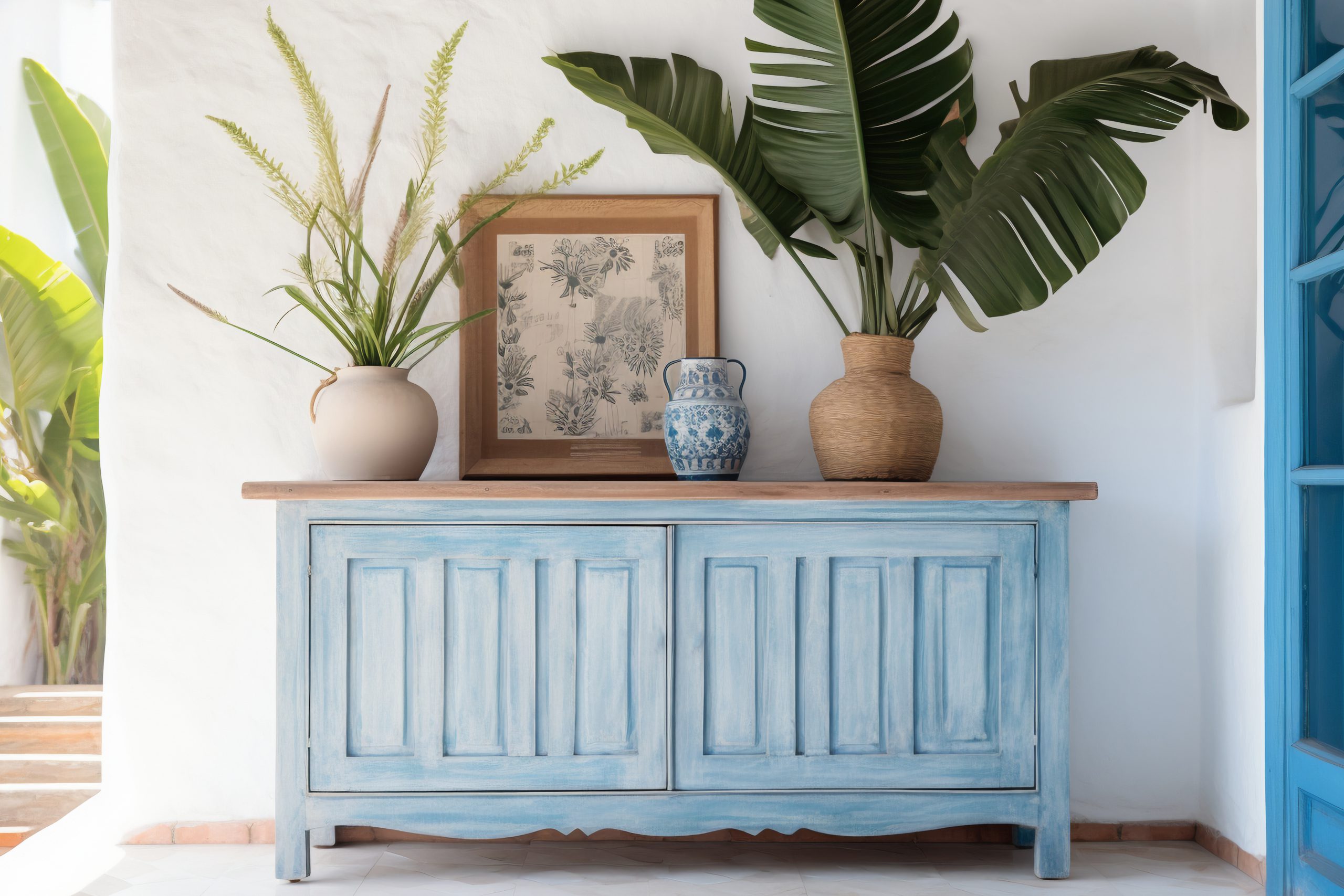 Komoda w kolorze błękitnym w nowoczesnym wnętrzu z roślinami i dekoracjami