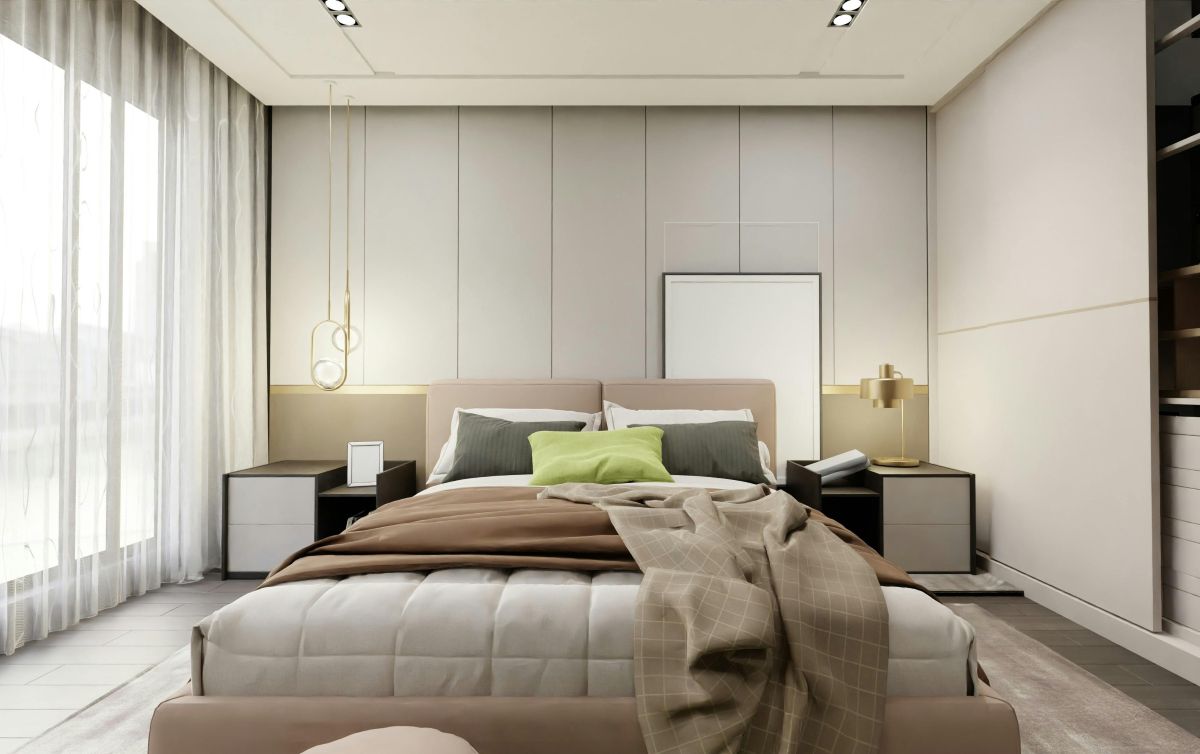 Beżowe łóżko kontynentalne z pojemnikiem w nowoczesnej sypialni